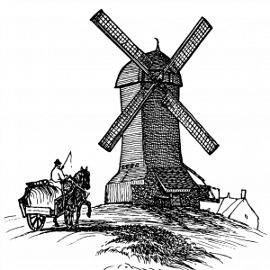 The sails being driven round by the force of the air, communicate their motion to various large wheels within, toothed, as are those in a clock. These again turn the stones, which are as large as a round table, and very heavy. Between these stones, the upper one revolving with surprising rapidity, the grain is gradually joggled in by the motion of the mill itself. When there, it is briskly crushed to atoms, and is afterwards rattled through cloths and canvass until all the coarser parts, the husks or bran and pollard are removed. Many grain-mills now are turned by the power of steam, which can be had when wind and water-mills cannot act.